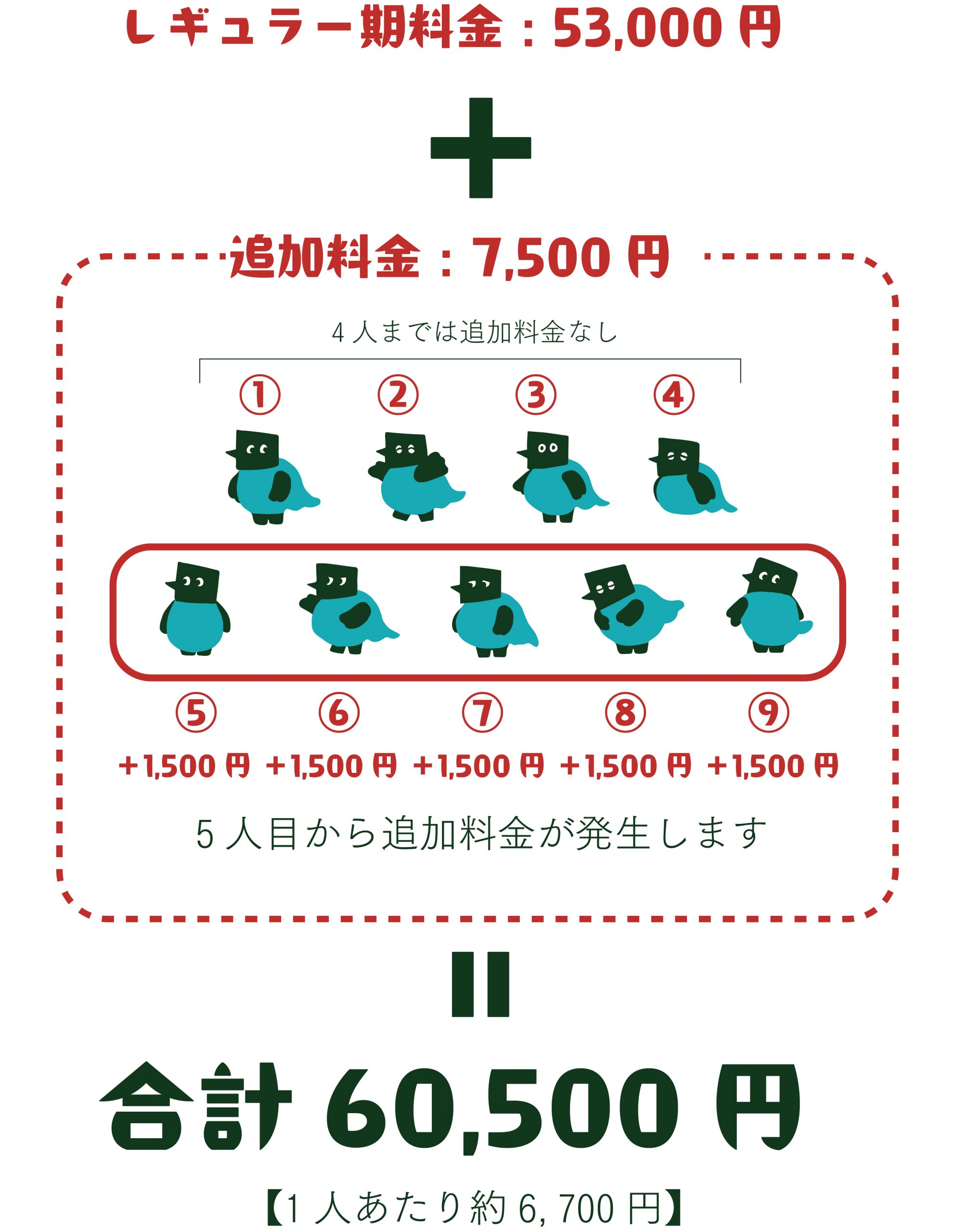 5名様以上でご利用の場合、大人・お子様(乳幼児含む)問わず、1名様につき1,500円の追加料金が発生いたします。