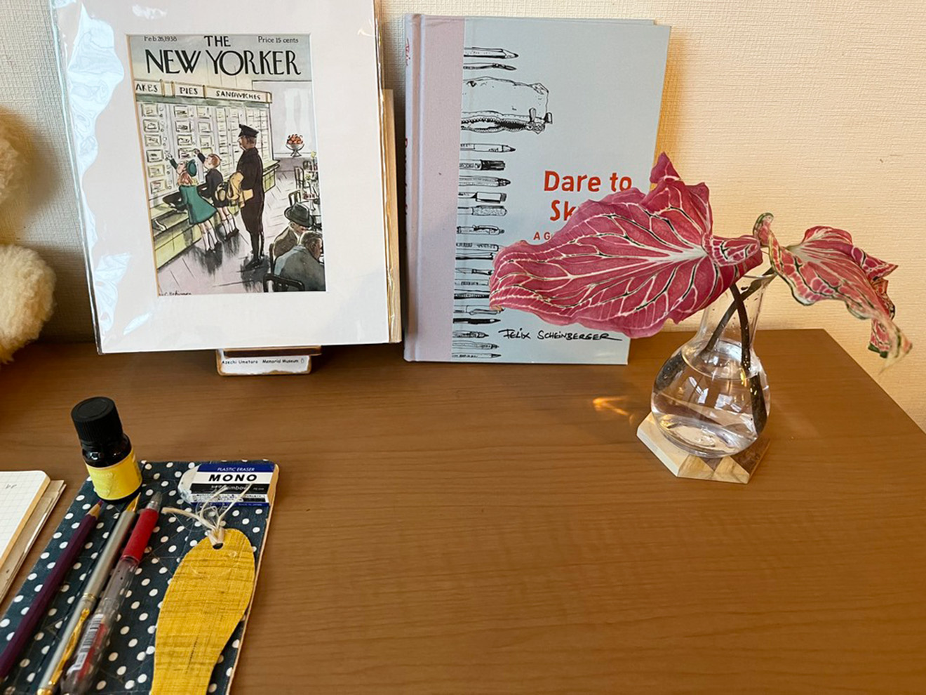 さっそく購入したカラジウムを机に飾ってみました。この存在感がシンプルな作業机を華やかにしてくれています。