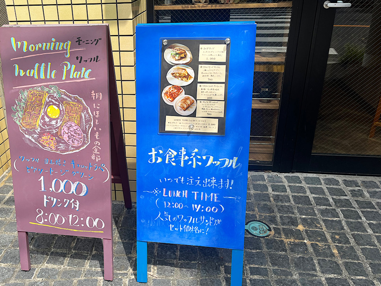 通りに置かれた看板には、おいしそうなワッフルプレートのイラストが。 「朝にほしいもの全部」と書かれたモーニングワッフルが気になり、入ってみることにしました!
