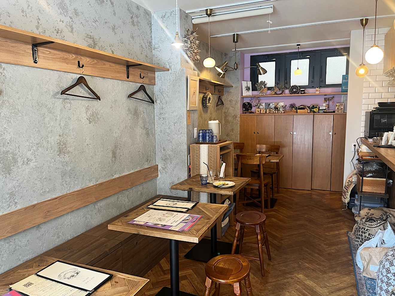 お店は奥に細長く、手前は壁側のベンチシートと2人がけのテーブル席が4つ、奥に4人席が1つあります。